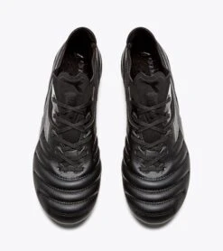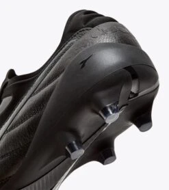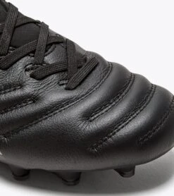 Men’s football boot with a white upper in soft premium leather. The gold details of the fregio and logos on the tongue and back stand out against the upper and match the cleats on the sole.
