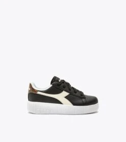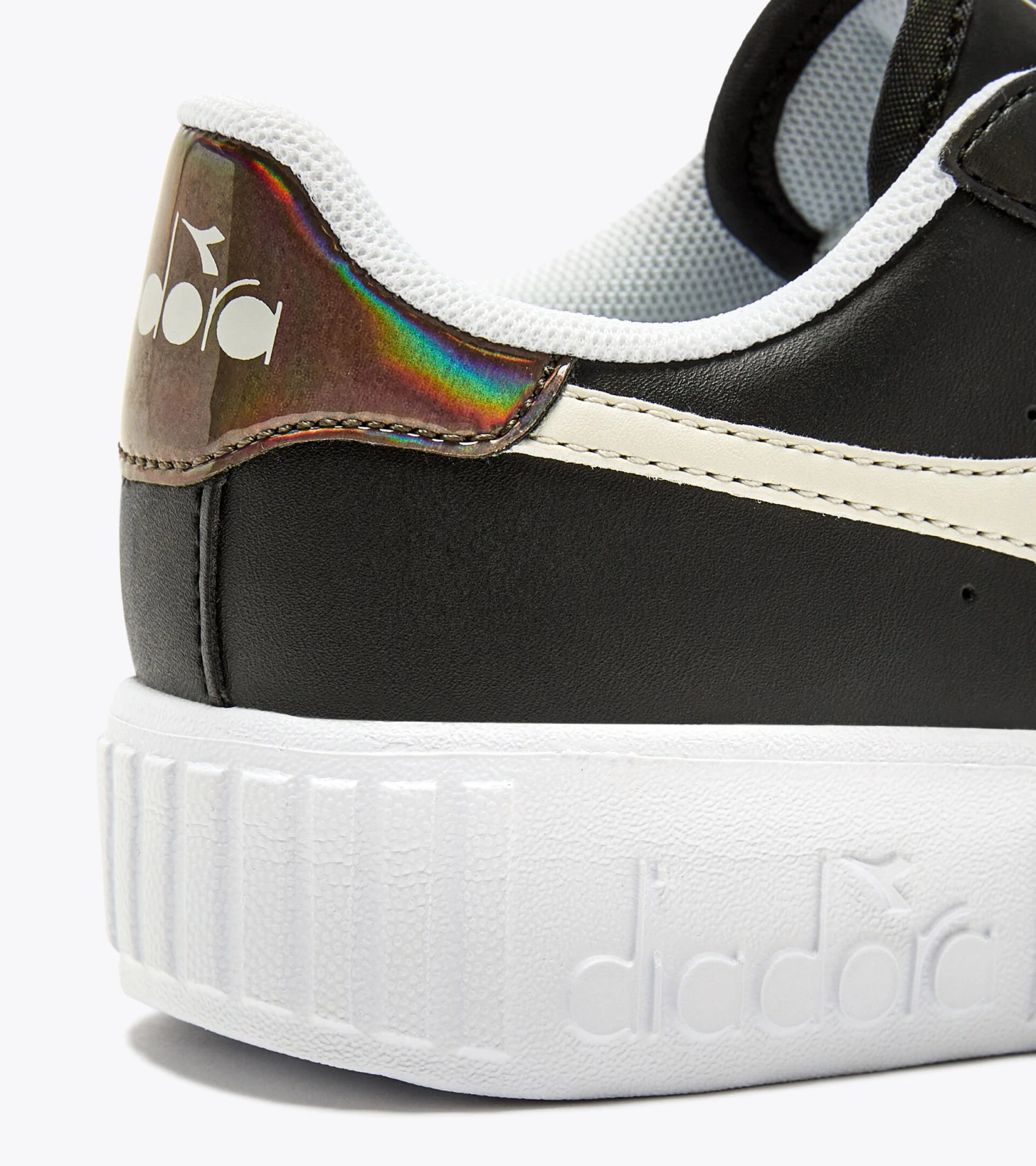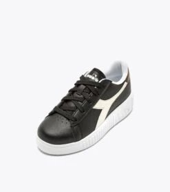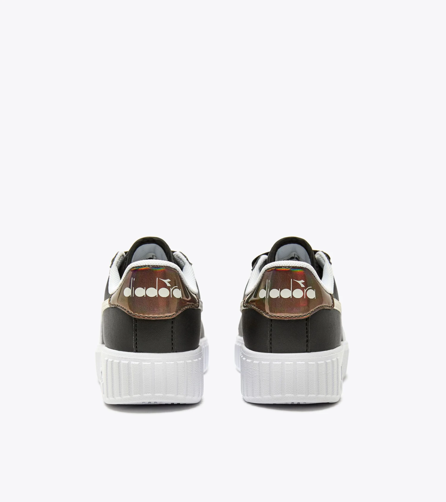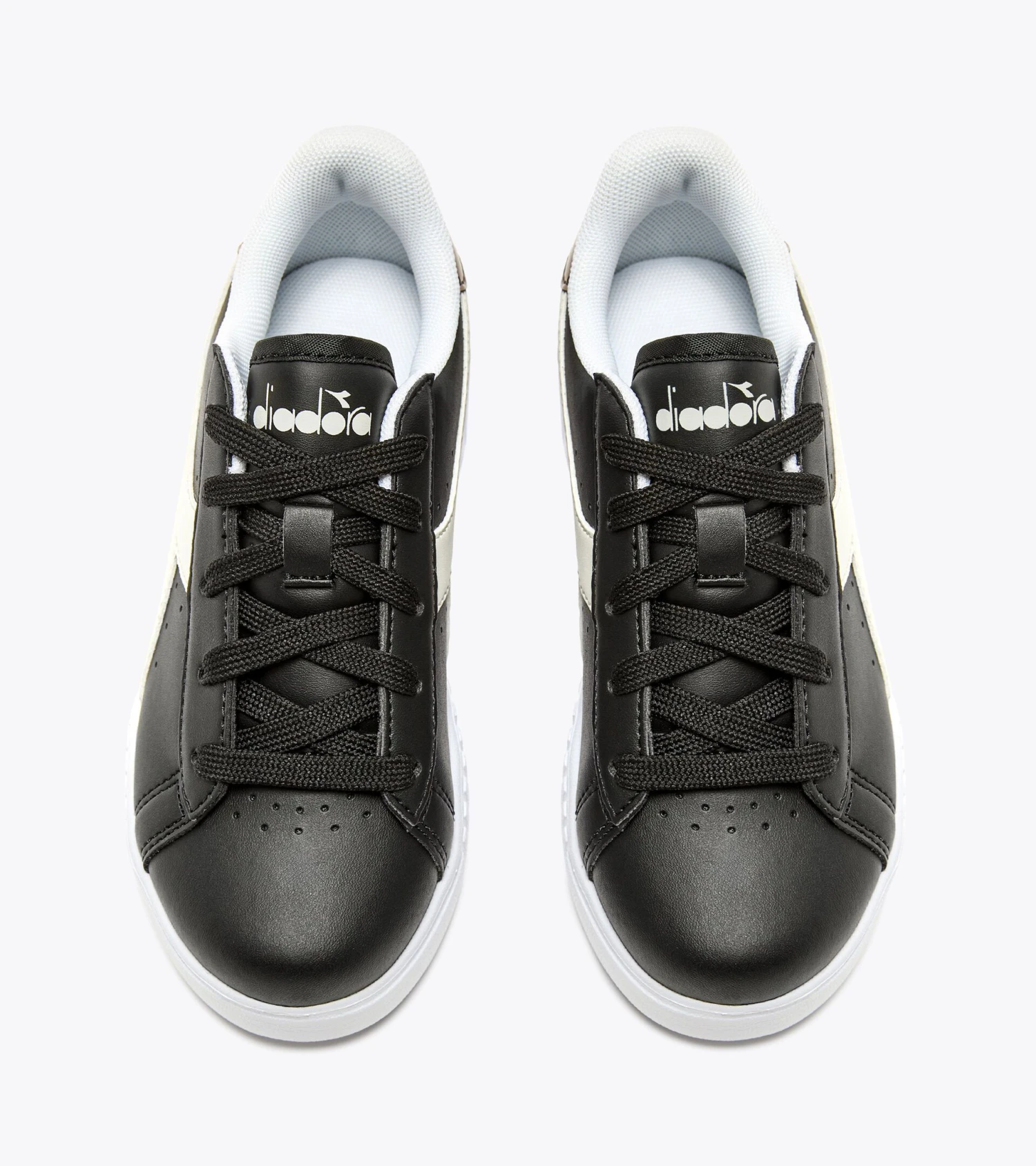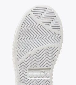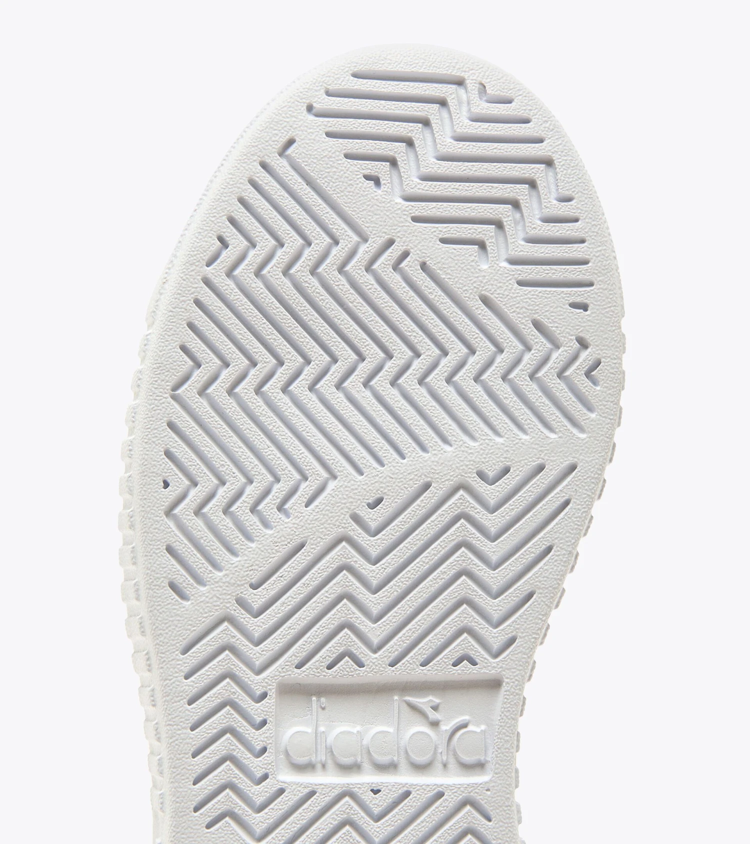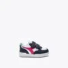 Gender neutral kid’s sports shoe with perforated details, the diadora fregio, a reflective pattern on the back and matching colourful sole.