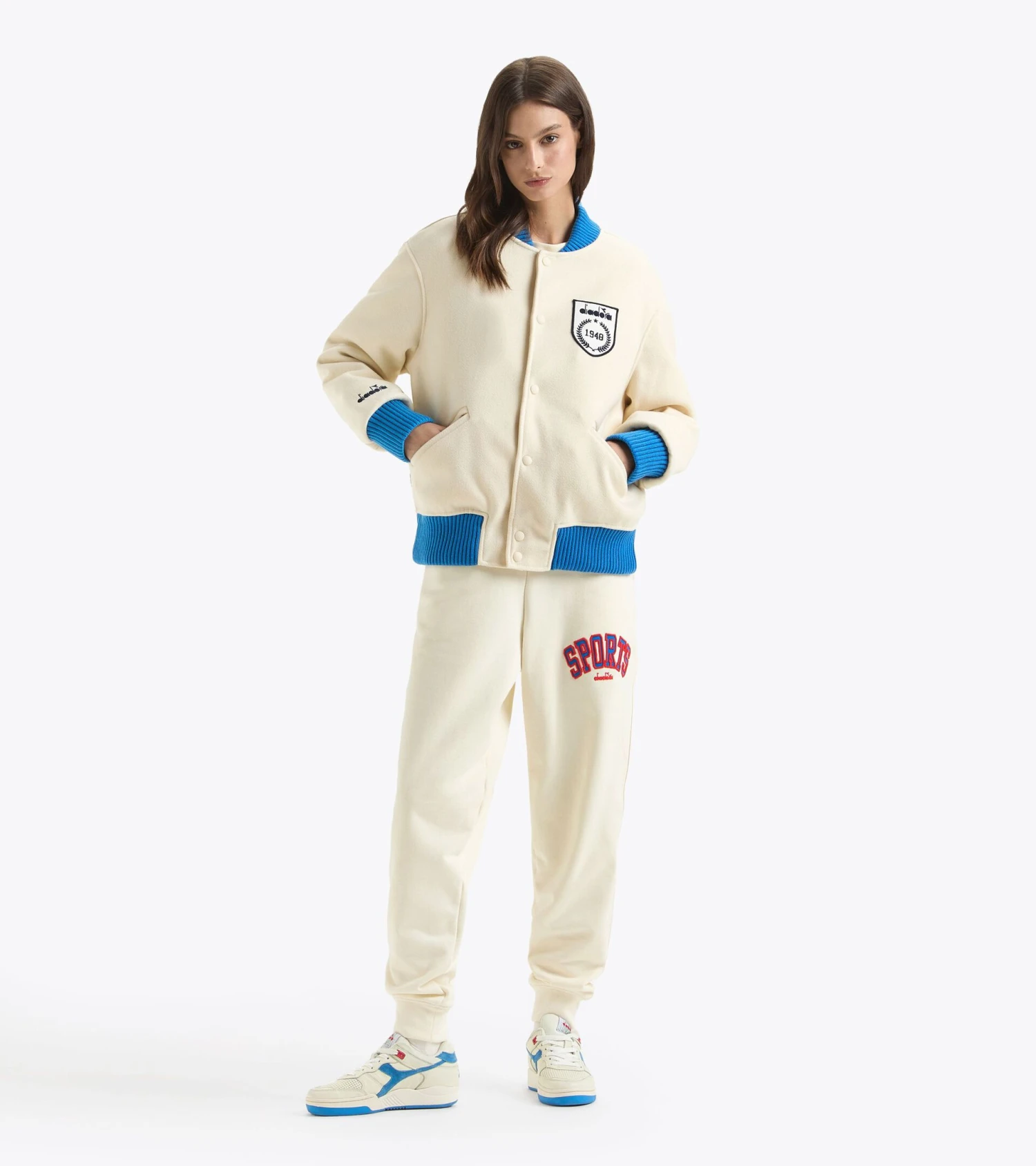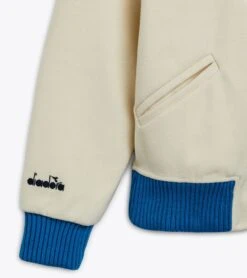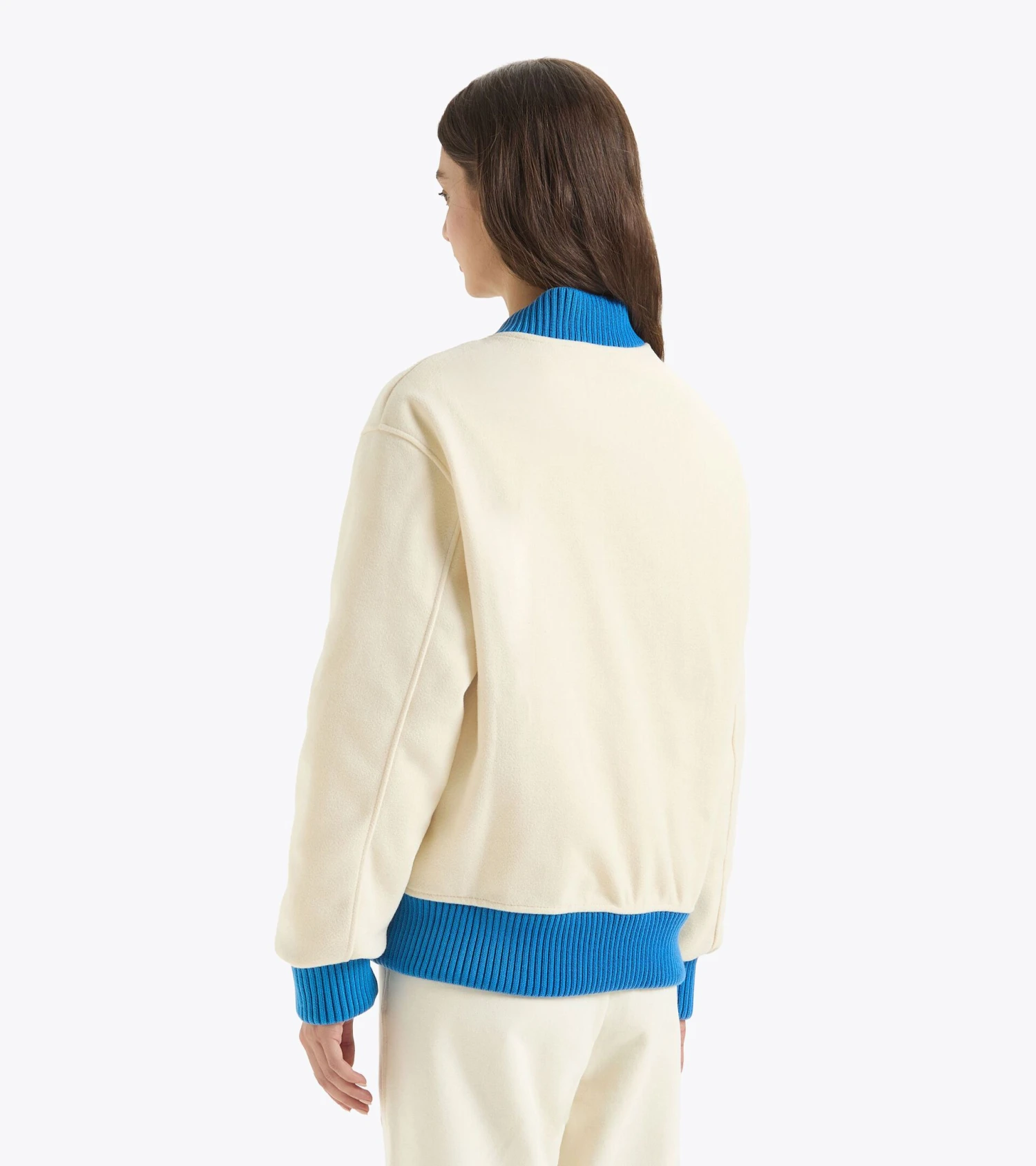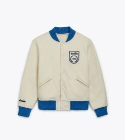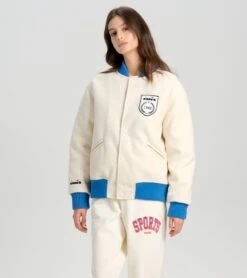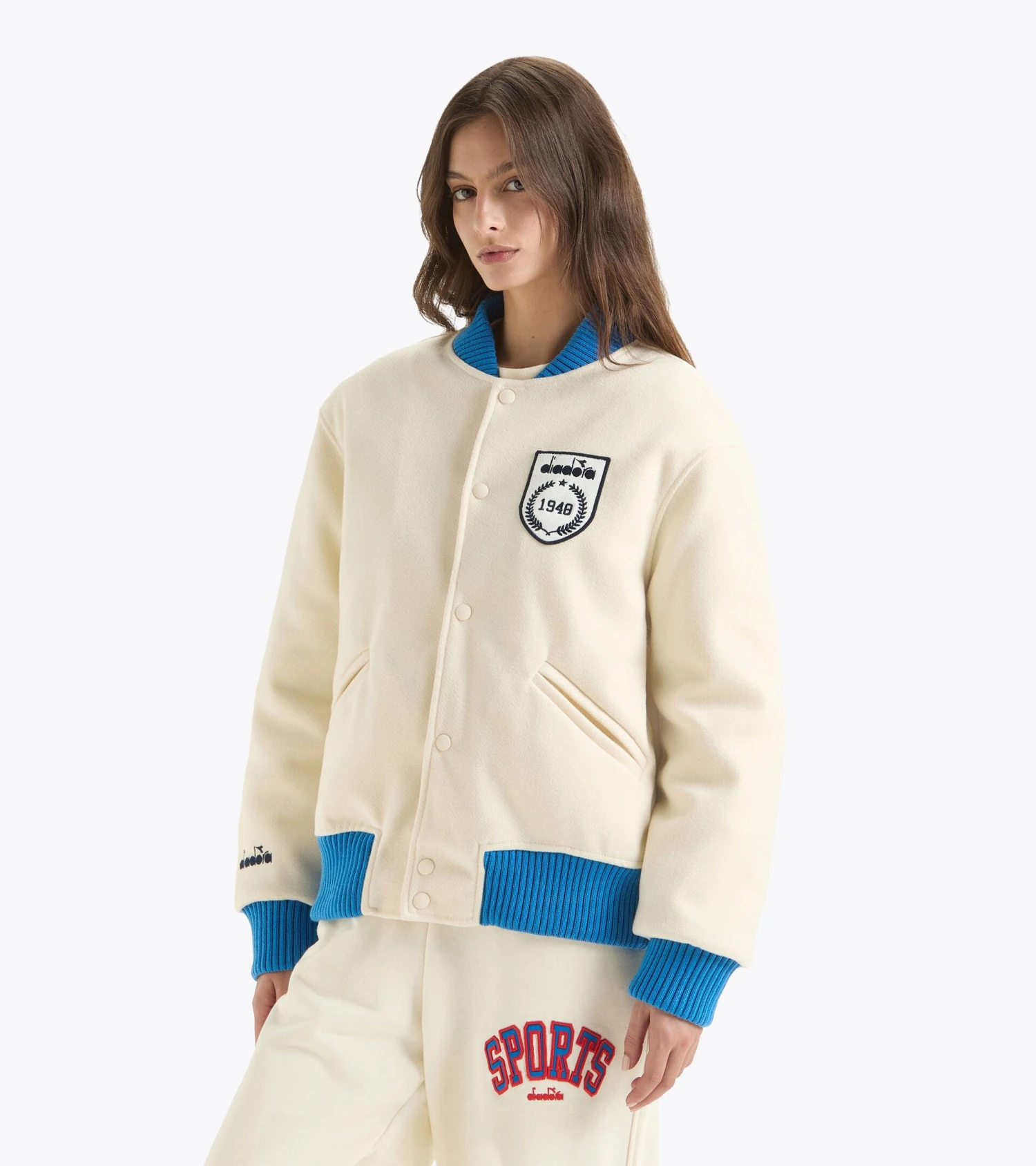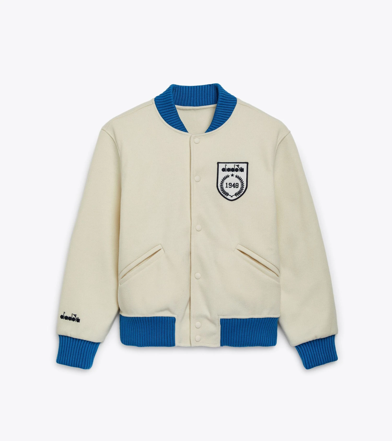 The Varsity Jacket takes center stage in the collection. This insulated and comfortably warm jacket boasts two front pockets and an internal pocket. It is secured with snap buttons and features ribbed wool cuffs and collar.