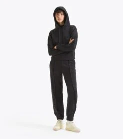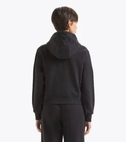 Women’s boxy fit hoodie featuring a squared design. The asymmetric pleats on the sleeves and ribbed finishes on the edges add a subtle yet undeniably stylish touch. Meticulously crafted with attention to detail, this women’s hooded sweatshirt combines comfort with a contemporary aesthetic, offering a sporty and fashionable look. Adjustable hood with drawstrings.