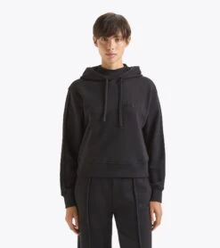 Women’s boxy fit hoodie featuring a squared design. The asymmetric pleats on the sleeves and ribbed finishes on the edges add a subtle yet undeniably stylish touch. Meticulously crafted with attention to detail, this women’s hooded sweatshirt combines comfort with a contemporary aesthetic, offering a sporty and fashionable look. Adjustable hood with drawstrings.