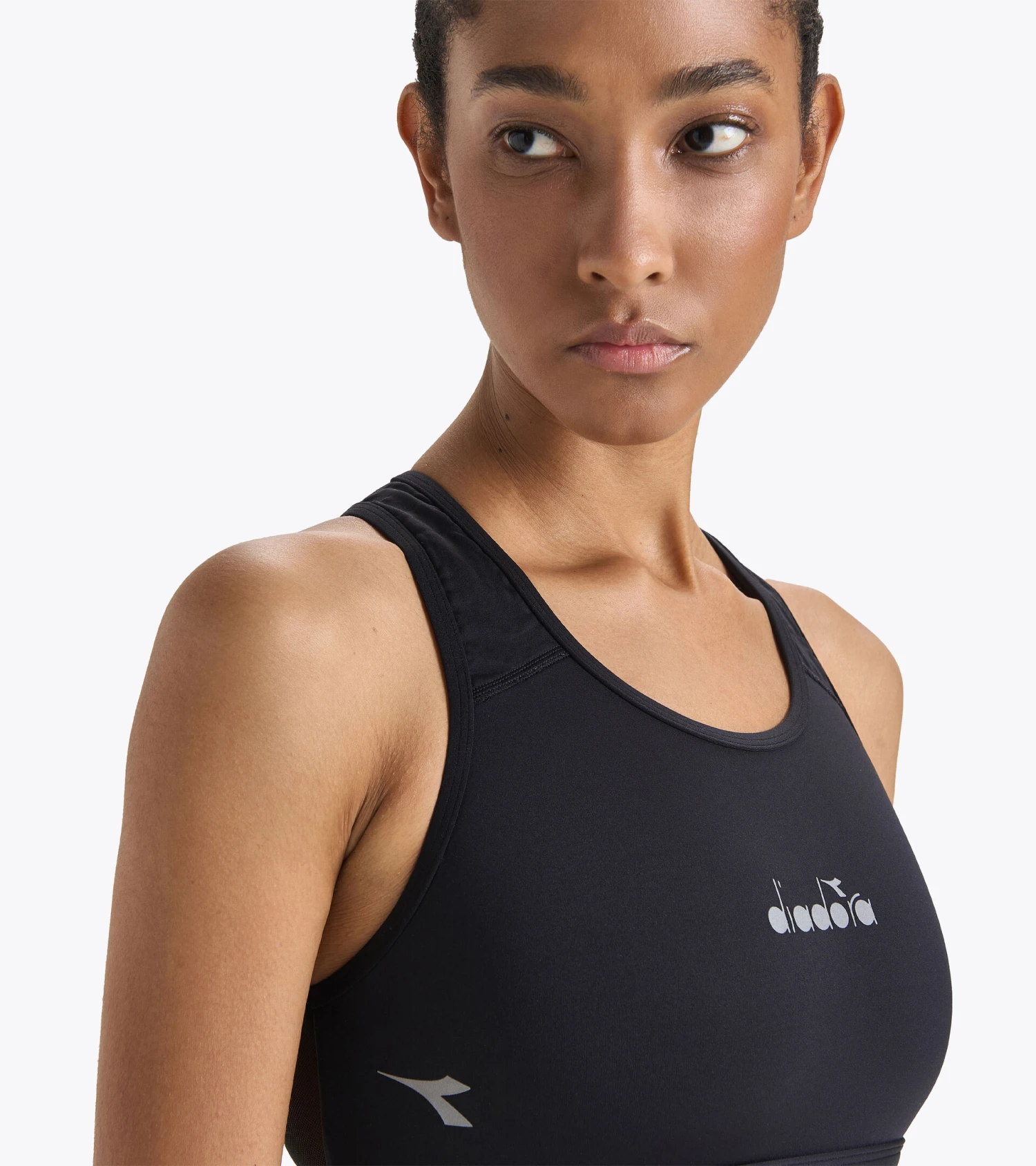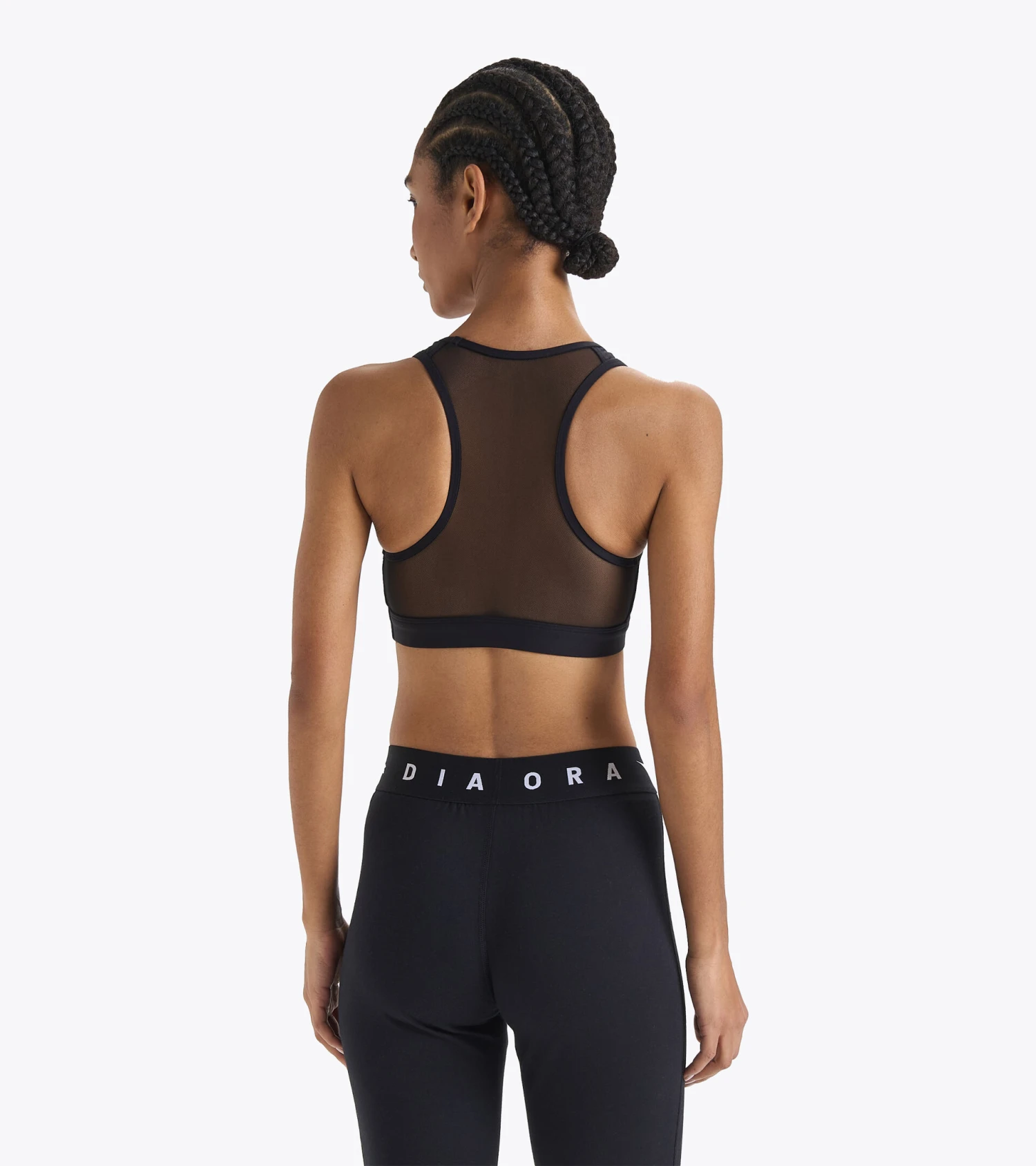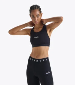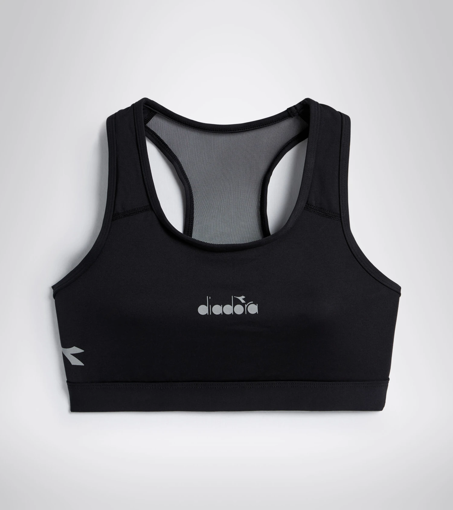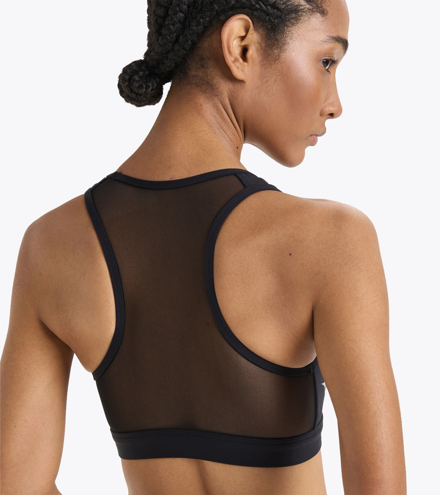 Training bra in a stretch high-compression polyamide fabric. Back in lightweight mesh, for a tulle effect.