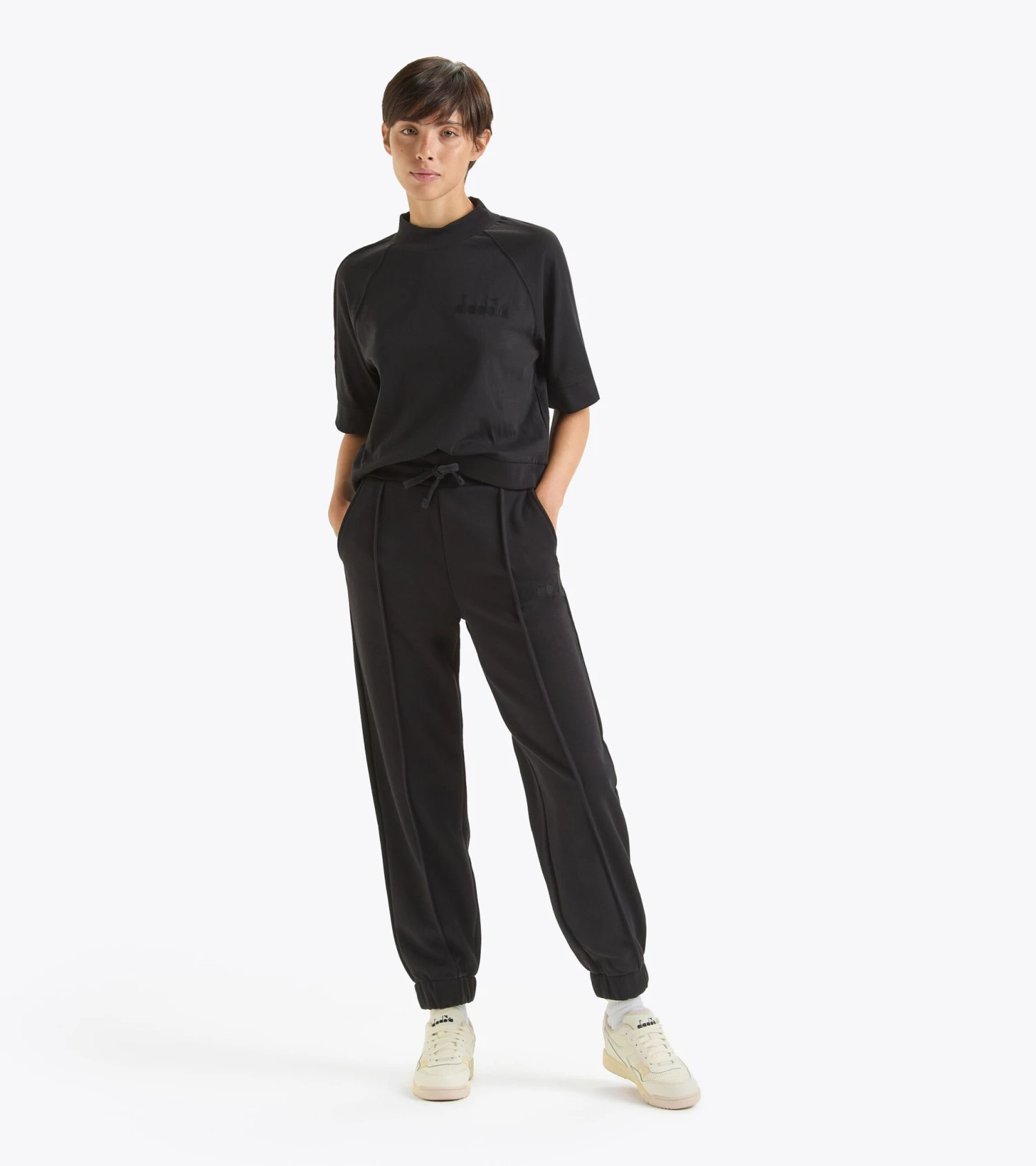 Women’s sweatpants featuring a relaxed fit. The vertical pleats running down the entire length of the legs and the high waist cuffs are subtle yet unmistakably stylish details. Designed with meticulous attention to detail, this tracksuit effortlessly combines comfort and contemporary aesthetics, creating a sporty and fashionable look. Complete with convenient side pockets and an embroidered logo on the thigh.