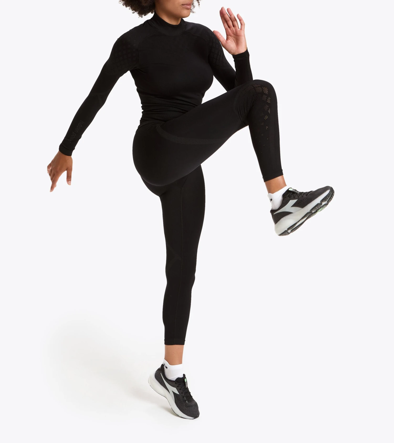 Highly technical materials and fabrics for these long women’s trousers that stand out for their comfort and breathability. Created in a soft and lightweight blend of polyamide and polypropylene. The latter – tone-on-tone – has the dual function of keeping the body dry and highlighting the logos. The pelvic area stands out for its more compact processing and greater protection against the cold.