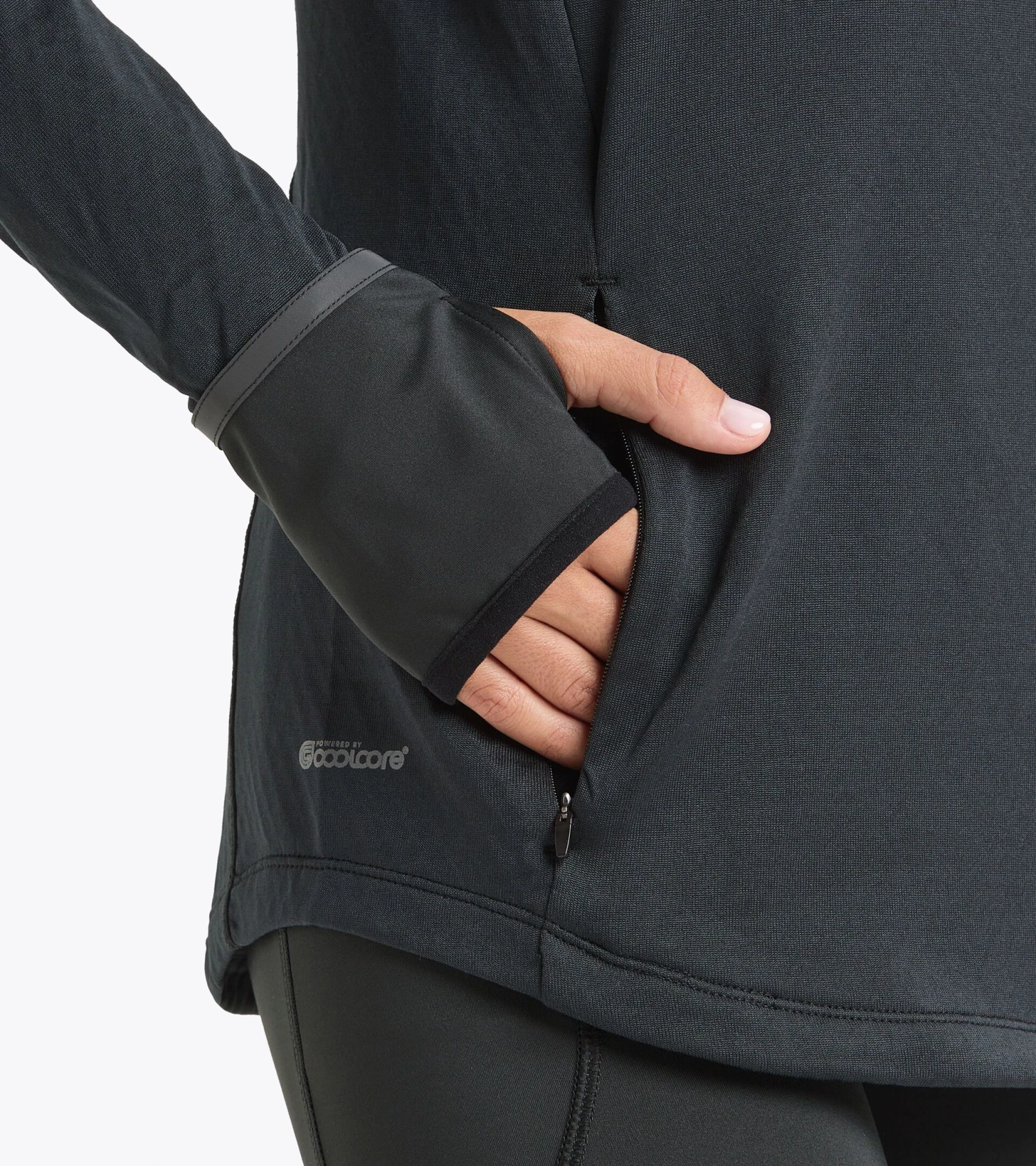 Stay warm and keep your body dry on chilly days with this women’s thermal shirt made from soft Coolcore fabric. The challenge of this garment? To provide you with maximum comfort and act as a temperature regulator, no matter the time of day or the intensity of your training routine. We make it possible with Coolcore: thanks to the material’s construction, sweat is quickly released, regulating your body temperature while maintaining breathability.