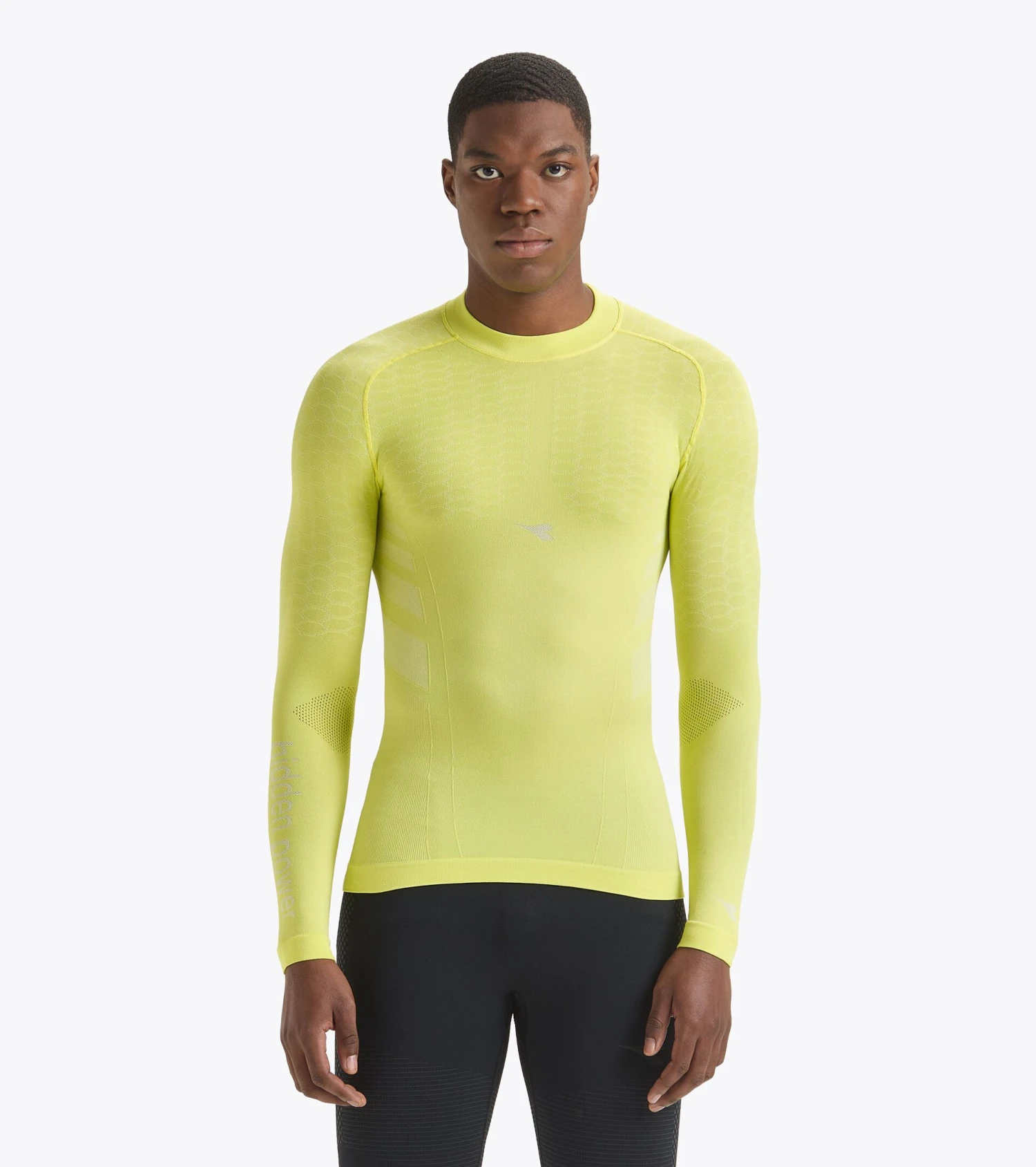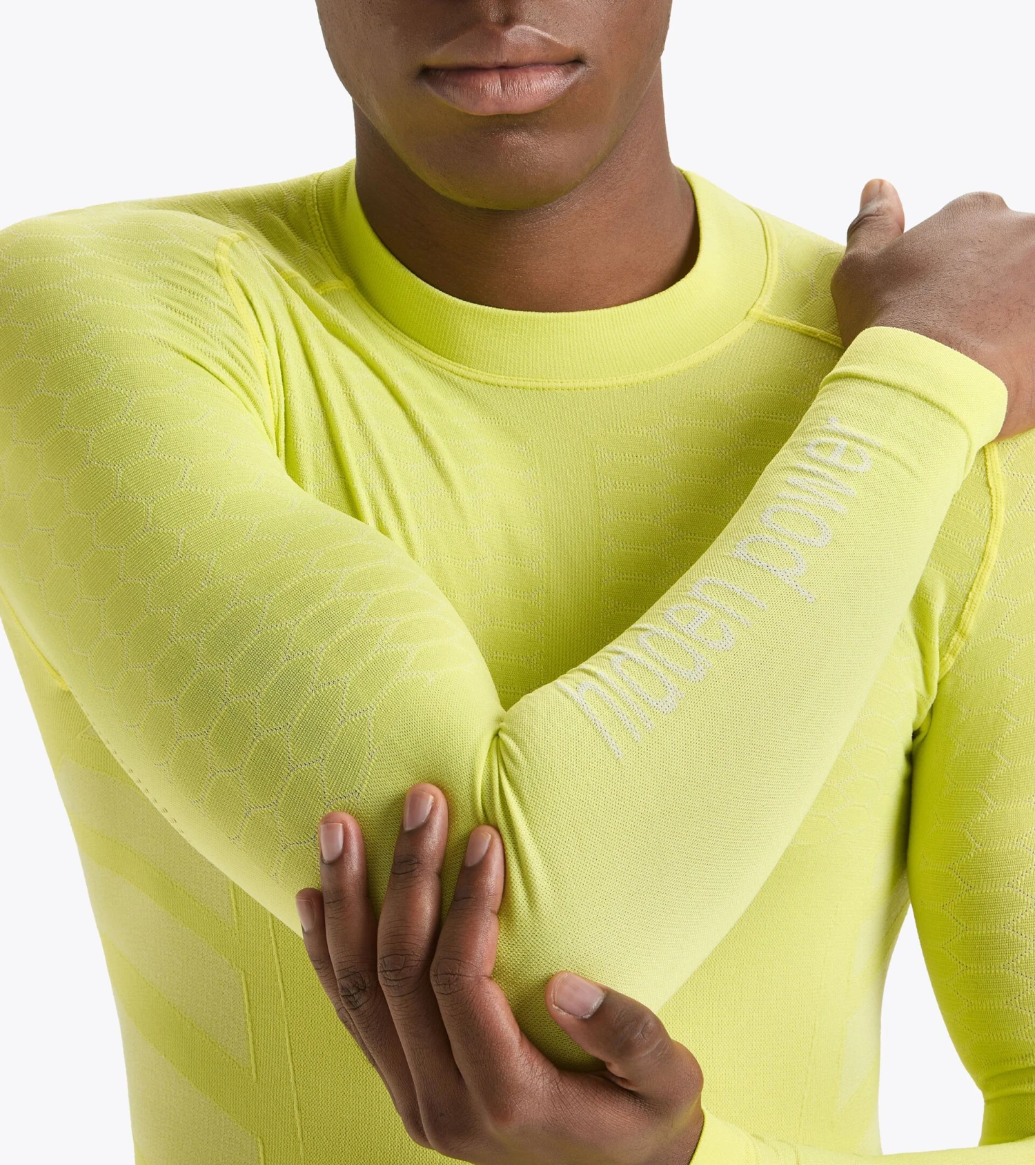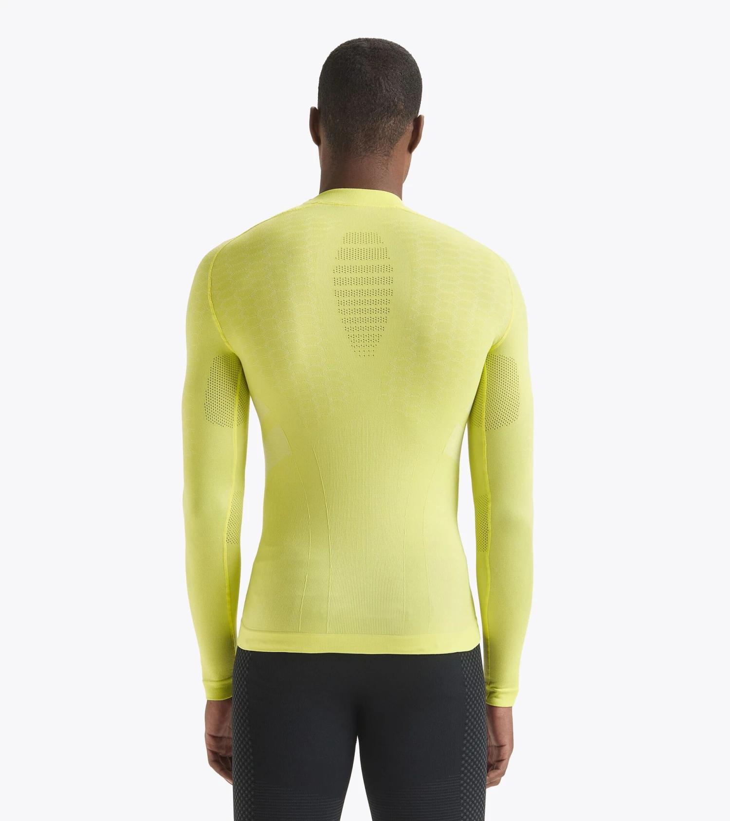 A long-sleeved polo neck shirt in a soft, lightweight blend of polyamide and polypropylene. The latter – tone-on-tone – has the dual function of keeping the body dry and highlighting the logos.
