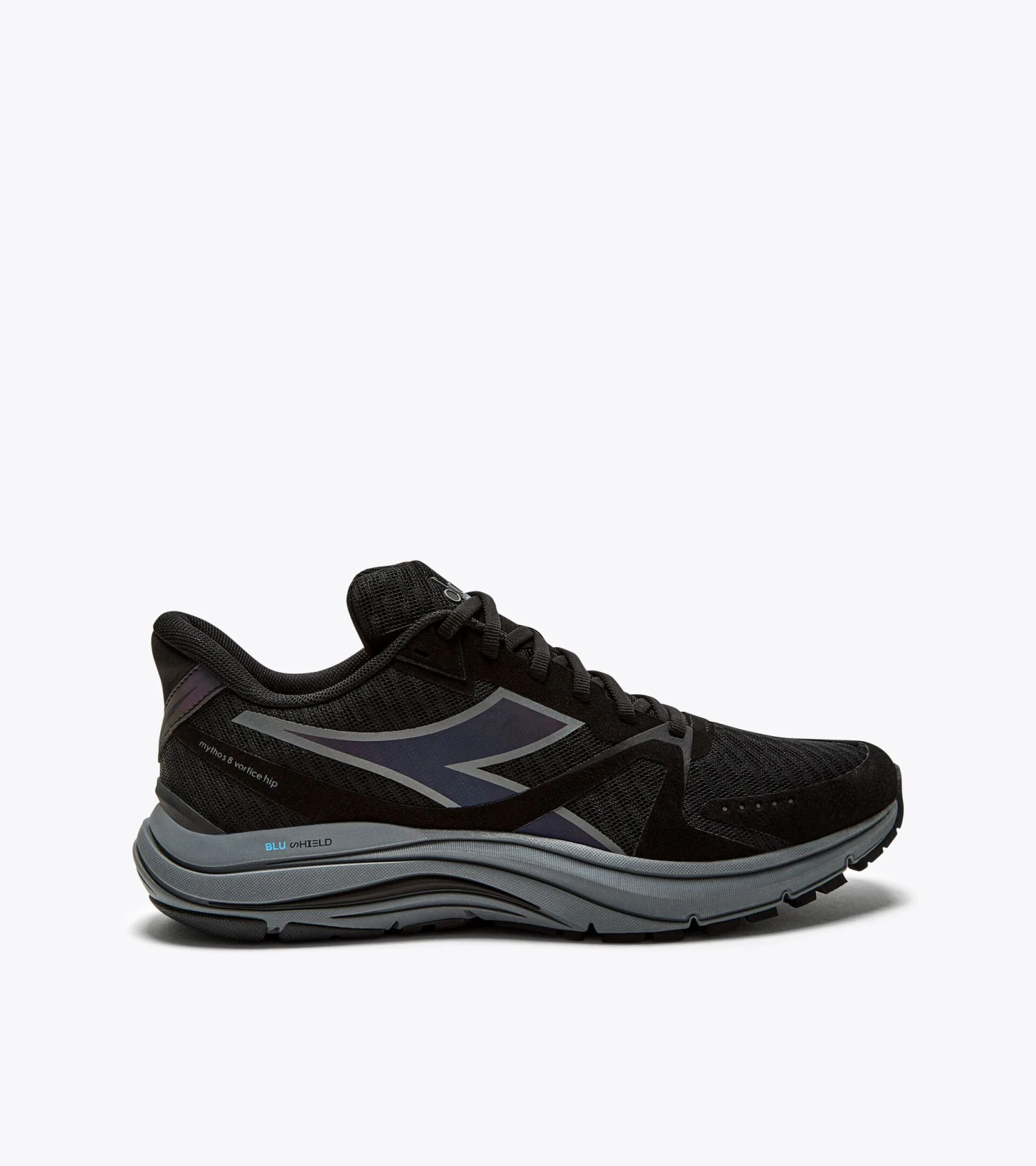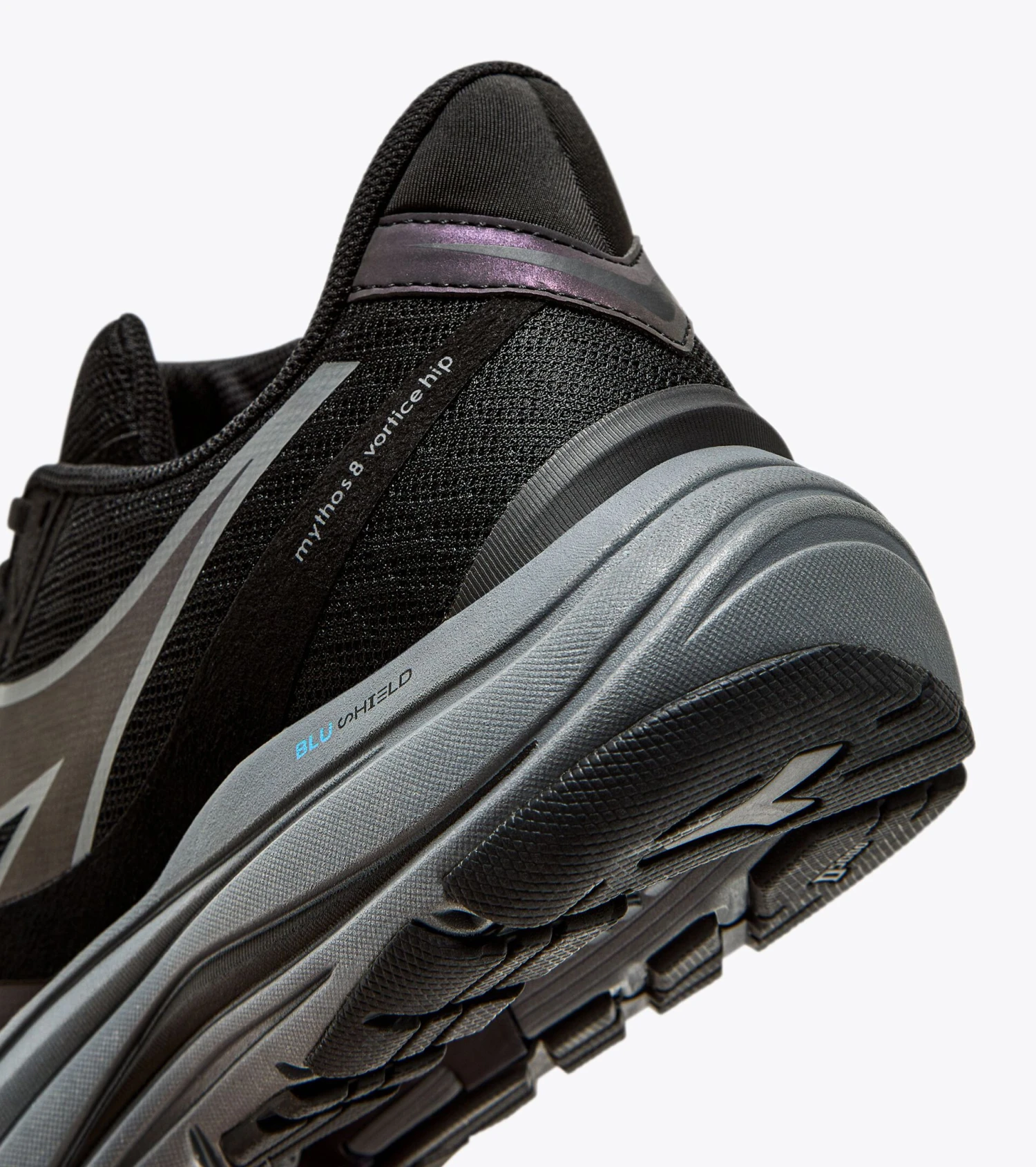 Mythos Blushield 8 Vortice Hip are men running shoes made of air mesh nylon upper, insole of elaston EVA. Midsole of light EVA with Blushield technology all over the foot area; outsole of blown flexoft at the front, wear-resistant Duratech 5000 compound at the heel.