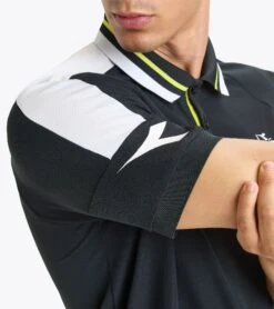 Short-sleeved Polo shirt made of stretch polyester piquet inspired by a retro vibe style. SS Polo Icon features contrasting knitted inserts on the collar and on the sleeve hems. The logo design complies with the tournament regulations.